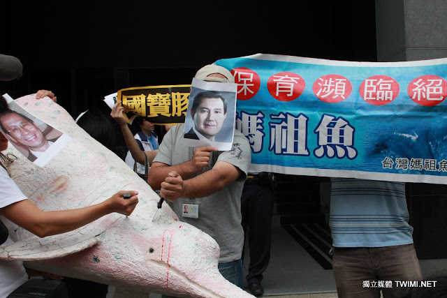 為了釐清國光石化開發是否對白海豚的族群生態造成影響,環保署於今日(6/9)下午兩點召開專家會議討論。環保團體於一點半在環保署前開記者會,以行動劇演出『刺殺白海豚』,呈現國光石化開發案對台灣的中華白海豚族群的衝擊,就是加速白海豚在台灣的滅絕。