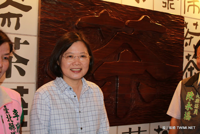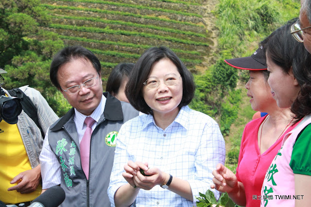 新北市長參選人民進黨主席蔡英文今(6/24)日上午前往坪林鄉上德村崩山坑茶園,在茶農解說下實際了解茶葉採收過程,蔡英文誇讚當地茶葉品質優良且甘醇,隨後也由茶農導引介紹新採收茶葉的製茶過程。蔡英文受訪時表示,這幾年來,看到本地產製茶的量與進口的量,呈現相對消漲,主要是主管機關對於外來的茶葉沒有積極處理,因此跟本地的茶葉相互混淆,影響在地茶農生計。