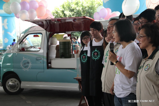 『迎接新幸福、喝咖啡、聊市政』-開啟市民對話的新時代。小英行動加油站今(7/31)日上午於華江橋下正式啟動,現場不僅安排悠揚的直笛樂曲,還有行動咖啡車、輕鬆的咖啡座椅擺設,同時發送特製的空飄氣球,吸引許多單車族及民眾同樂,新北市長參選人民進黨主席蔡英文隨後並自己駕駛另一輛小英行動加油站亮相。