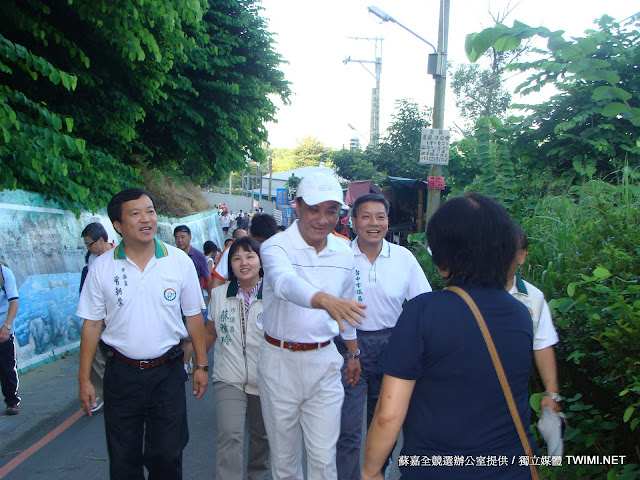 蘇嘉全今天一早就從九號步道的登山口上山,一路上他親切地和登山步道旁的商家打招呼,也向一早前來登山的山友握手致意,商家和山友們也都熱烈的回應。隨後蘇嘉全來到觀音亭休息區,廟方並特別介紹他給在場的山友,山友們也報以熱烈的掌聲。