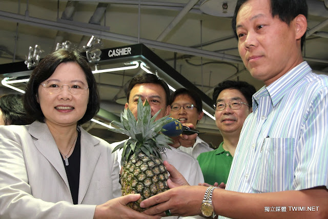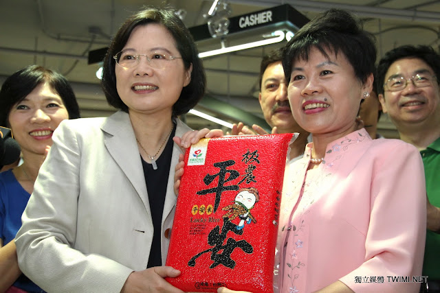 新北市長參選人民進黨主席蔡英文今(8/4)日上午前往板橋農會活力超市參觀,關心台灣精緻農業的發展現況及農產品的成功行銷經驗,全程由農會總幹事王雪慧詳細引導解說,理事長郭進源及總幹事王雪慧最後分別致贈鳳梨及平安米,表達祝福。