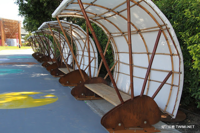 一座造價 34988.43元的覆蓋帆布遮陽休息座椅 C,花博還沒開始整個座椅金屬部分已經嚴重生鏽,而風稍微大一點時整個座椅嚴重搖晃,到花博開始時還能坐嗎?