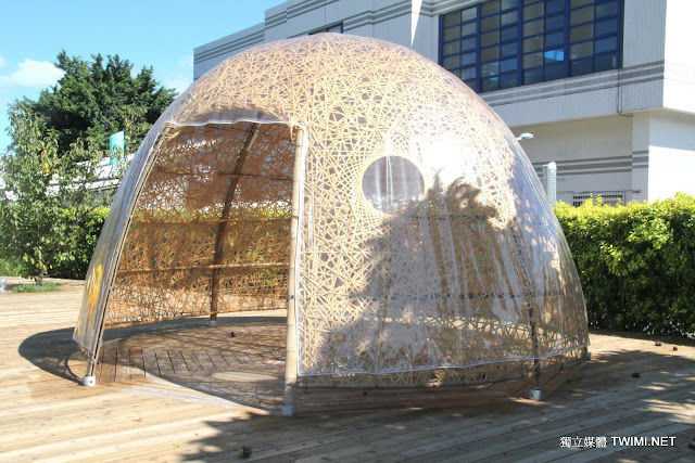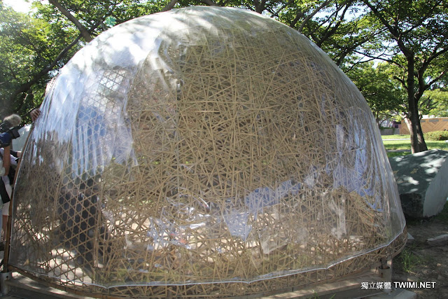 另一座也是用桂竹接和蓋上白色壓克力帆布休息站 B(直徑 3.5M + 座椅)一座造價也要299904.02元,而外面那塊白色壓克力帆布含車邊、銅扣 /一座則是要 25071.64元,帳棚裡的座椅一張則是要 7497.52(椅腳卻是用紙桶做的)。
