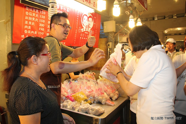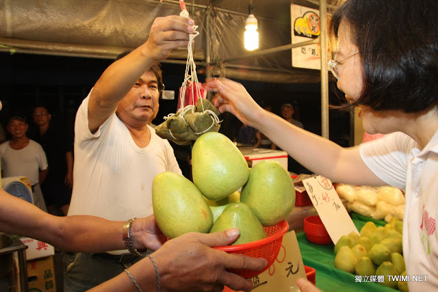假日的汐止黃昏市場人潮不少,遇到蔡英文來拜票不少民眾驚呼好幸運,趕緊上前與蔡英文握手、拍照,攤商更是反應熱烈,舉凡好意頭的食物都紛紛送上,包括粽子(包中)、菜頭(好彩頭)、肉圓、貢丸(圓圓滿滿)、柚子等,都是要預祝她選舉順利,讓蔡英文感動的頻頻道謝,蔡英文的超人氣在菜市場掃街拜票時更是展露無疑。