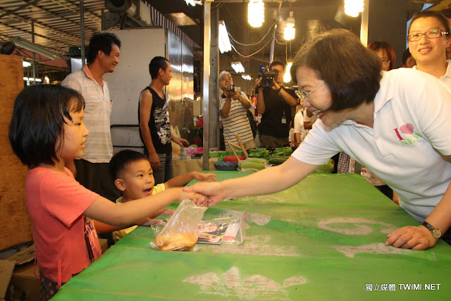 新北市長參選人民進黨主席蔡英文今日(9/12)行程來到汐止黃昏市場,繼續她的『蔡市長掃菜市場』活動。今天掃街有別於以往除了有地方民代陪同外,還多了一群小朋友從頭到尾陪同掃市場,不但沿途跟著拜票還拿起相機充當小記者拍照,讓這場『蔡市長掃菜市場』更是熱鬧。